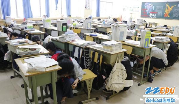同学们听到地震的信号时迅速采取避险措施躲到桌下