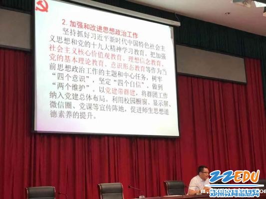 会上,学校党委书记孙国岩首先向全体党员传达学习了8月23日省委常委、市委书记徐立毅等领导在全市教育大会上的重要讲话精神。徐立毅强调,要深入贯彻习近平总书记关于教育工作精神,落实教育大会部署,加快推进教育现代化,高质量建设“美好教育”,努力办人民满意的教育。教育要解决好“培养什么人”和“发展什么样的教育”等问题,要牢牢把握立德树人根本任务,强化政治引领,优化教育评价。