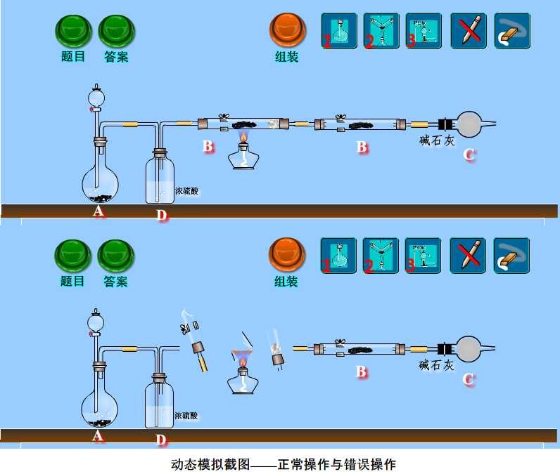 这类课件能根据设计者的要求实现判断正误(提示“真棒”“再想想”等);实验现象动态模拟(如点燃酒精灯,产生沉淀等);还能模拟错误操作(如不经验纯就加热含氢气的玻璃管产生爆炸等)。