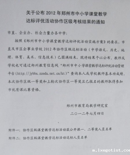 按照《郑州市中小学课堂教学达标评优活动实施方案》的要求,市直及市区企事业学校2012年协作区级达标活动(中学语文、历史、地理、体育、美术、信息技术)已圆满结束。近日,郑州市教育局教学研究室下发了《2012年郑州市中小学课堂教学达标评优活动协作区级考核结果》的通知。