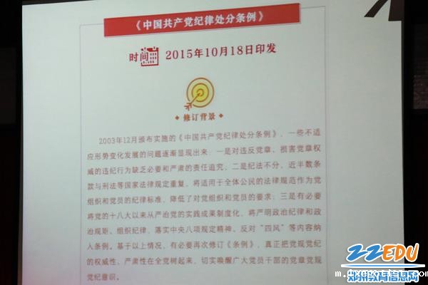 纪委书记陈晖对新修订的《中国共产党纪律处分条例》(以下简称《条例》)的修改内容进行了概括解读,从修改《条例》的重大意义、修订后的八大亮点、重点条款解读等方面对新修订的《条例》进行了深入浅出的讲解。这是第三次修订《条例》,修订后共11章142条。此次修改《条例》具有重大意义。陈晖指出此次修订《条例》的特点:一是突出党的纪律建设,落实新时代党的建设总体要求和全面从严治党的战略部署;二是突出习近平新时代中国特色社会主义思想指导;三是突出党的全面领导,加强“两个坚决维护”;四是突出“四个意识”;五是突出运用监督执纪“四种形态”;五是突出重点查处党的十八大以来不收敛、不收手,问题线索反映集中,群众反映强烈,政治问题和经济问题交织的腐败案件,违反中央八项规定精神的问题。