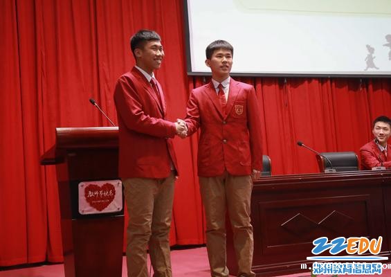 “带着一种自立精神做一切有利于社会的事情,带着一种科学态度在人生的道路上求索,带着一种人文情怀关心身边的他们,带着一种共生意识在社会中与他人和谐相处,带着一份领袖气质在人群中展示自己的魄力!”,在工作报告审议结束后,新一届学生会宣誓就职,从上一届学生会手中接过了自己的责任。