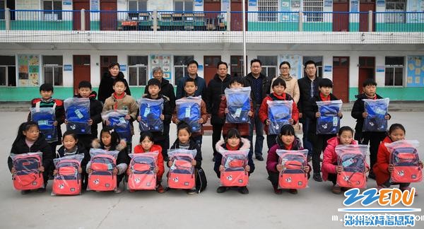 工会主席陈晖为帮扶村希望小学学生发放书包