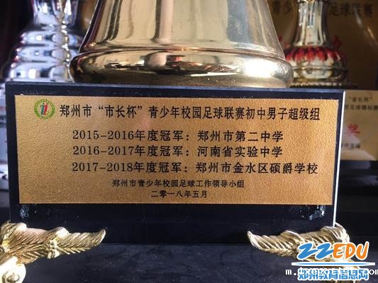 会上颁发了郑州市“市长杯”青少年校园足球联赛初中男子超级组2017-2018年度总冠军奖杯,金水区硕爵学校凭借优异的表现将这项殊荣收入囊中;九中和硕爵学校的运动员宋炫瀛和霍英豪荣获校园足球优秀选手的称号,宋炫瀛2018年以优异的专业水准和文化课成绩被北京大学录取,此次专程从北京赶回郑州参加此次会议登台领取优秀选手的奖杯,为将来即将面临高考的校园足球运动员树立了学习的榜样和目标。