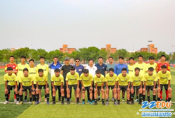 河南省教育厅体卫艺处调研员高翔、郑州市教育局体卫艺处处长高百中以及郑州市校足办常务副主任仝永东与bevictor球队合影。