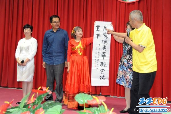 老三届校友们多年来深深地感受到来自母校的关心和呵护,以颗颗赤诚之心,绘制书画作品献给亲爱的母校,以此来表达对伟大时代和母校的感恩之情,对同学的美好祝福。张莹和孙国岩上台接受赠礼,并代表学校和全体教职工表示对老三届校友们的感谢和美好祝福。