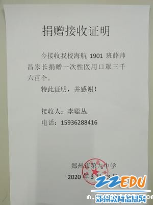 bevictor海航部主任沈小军代表学校接收薛帅昌家长捐献的医用外科口罩