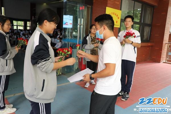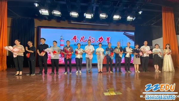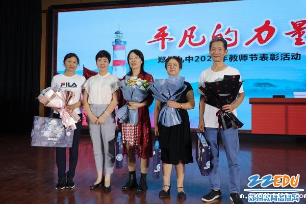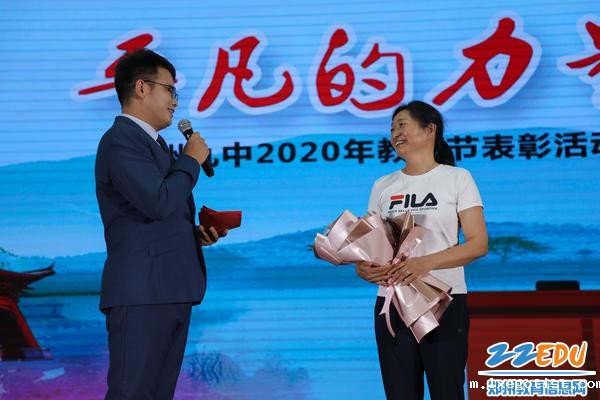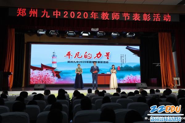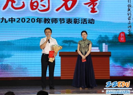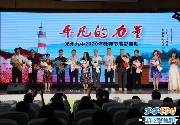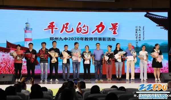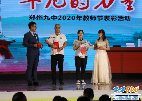 同学们深情的诗朗诵《献给老师的诗》拉开了颁奖仪式的序幕。登台领奖的老师们个个神采奕奕,脸上洋溢着自豪和满足——这一年,无论是即将退休的老教师,还是刚刚入职的“新鲜人”,无论是直接面对学生传道授业的一线教师,还是奔忙于防疫一线的相关负责人员,无论是站在“停课不停学”最前线的班主任,还是默默坚守上好每一节课的任课教师,都为教学秩序的正常和学生学业的继续贡献了不可磨灭的力量。退休教师代表金祥荣老师述说了九中的传承和自己教师生涯的骄傲,郑州“最美教师”苏斌老师述说了自己对学校和学生的感谢,反复说着那句“应该的”,防疫工作先进个人王琳老师微笑着说她愿做学校、学生的守护者,郑州市师德先进个人万云方老师则感慨着台下前排坐着自己的师傅,台上身边站着自己以前的学生,台下后排坐着自己现在的学生,感动于教师职业给予自己的成长和幸福感。