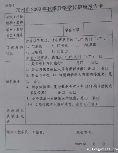 为做好预防甲型流感第一课,学校要求校医要认真收集整理有关甲流的学习材料并印发给学生人手一份。各班主任、处室主任必须在开学一周内做好暑期学生、教师外出情况摸底工作,并认真填写郑州市2009年秋季开学学校健康报告卡。年级长、中层干部要对非班主任和处室工作人员进行培训,使其掌握甲型H1N1流感及防控的相关知识,并通过班会让每一个学生认真学习。各班要做好学生每天的晨检工作,填写晨检表,于每天下午4:30以前交到政教处,政教处整理后于5:00以前上交市教育局。对于缺课的学生要追查其未到校的原因,特别要调查其是否有甲型流感的相似症状。严防外来人员进校。外来车辆(除了上级主管部门事先联系好的车辆外)一律不得入内。家长联系不到班主任不得入内。食堂工作人员不得随意出入校园。一旦发现有甲流症状的任何情况,班主任和处室主任必须第一时间上报校长和校医,学校必须及时把有关情况上报市教育局。