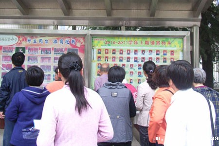 很多家长在学校橱窗前观看学校各种活动的宣传版面