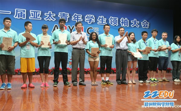 (原)郑州市委常委、宣传部部长王哲,河南省教育厅副厅长尹洪斌为参加第一届亚太学生青年领袖大会的学生颁发结业证书。