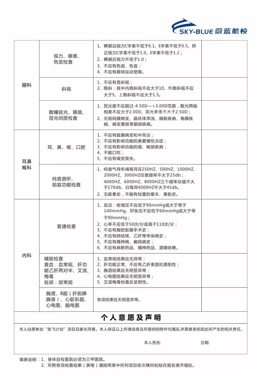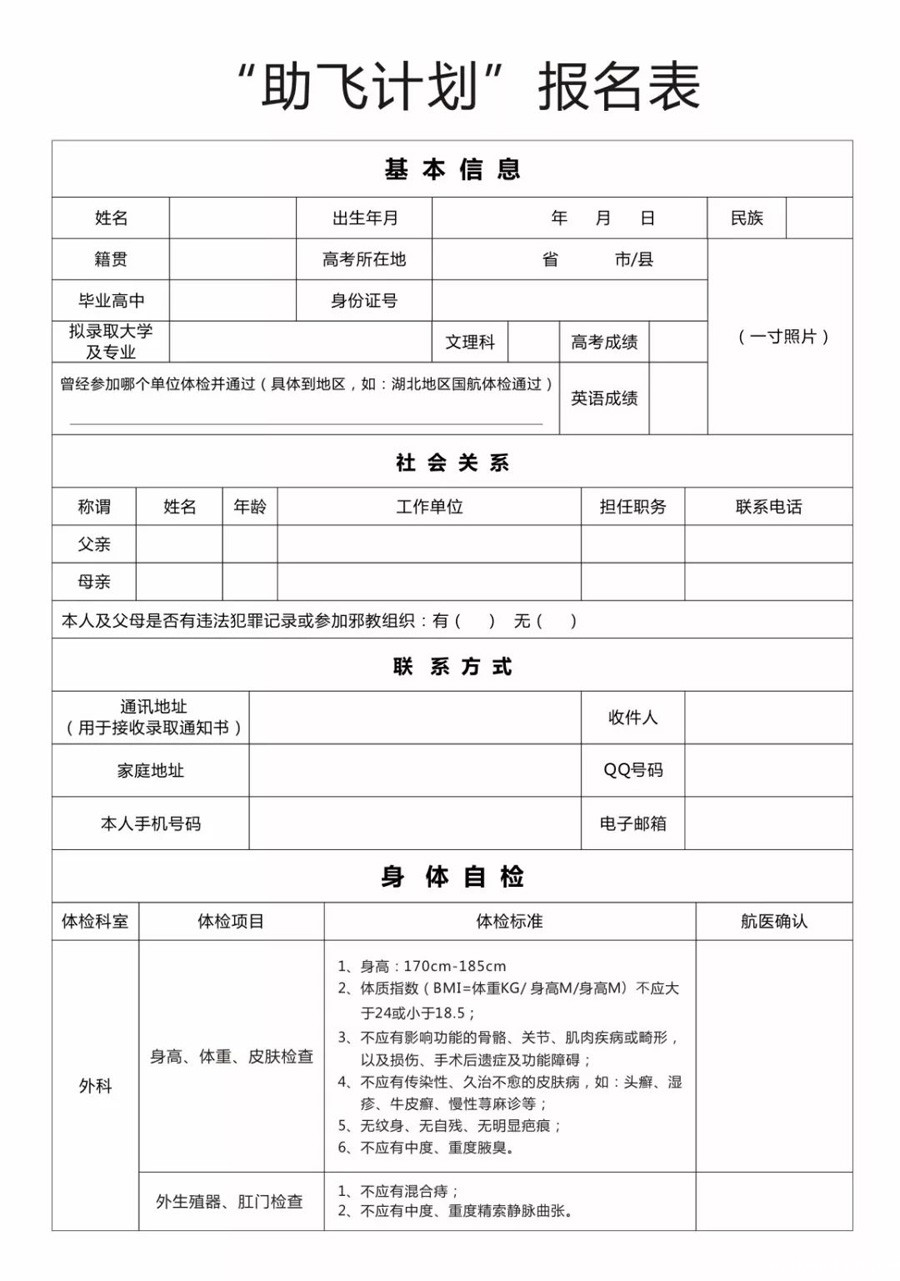 【高中毕业生“助飞计划”】蔚蓝航校民航飞行员报名表 来源:蔚蓝航校 作者:蔚蓝航校 发布时间:2018-06-13 16:44:36 【字体:小 大】 “助飞计划”高中预备飞行员火热招收中....为了适应中国民航航空人才培养战略的发展要求,及早发现和培养更多热爱民航、适合飞行、素质全面的飞行学员苗子,2018年蔚蓝航校开展“助飞计划”项目,在面向全国应届高中毕业生中投放该项目计划150名,(附:招飞简章可点击了解)符合招收条件的学生可直接打印出报名表,按照报名表要求自测身体。 分享到: 【打印正文】